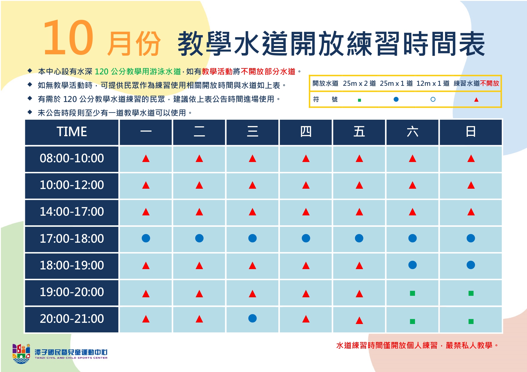 本中心泳池清場時間為平日早上10:00~10:30,於此時段暫停使用,使用之民眾須離場以利場地整理。